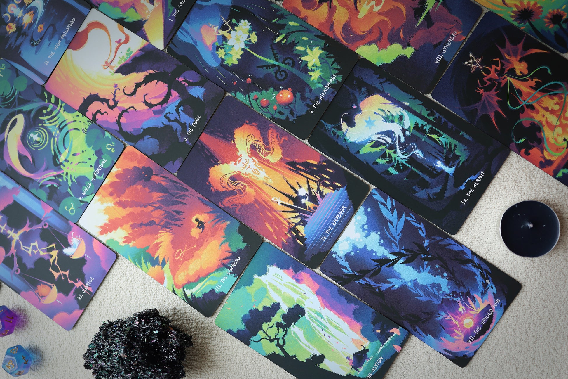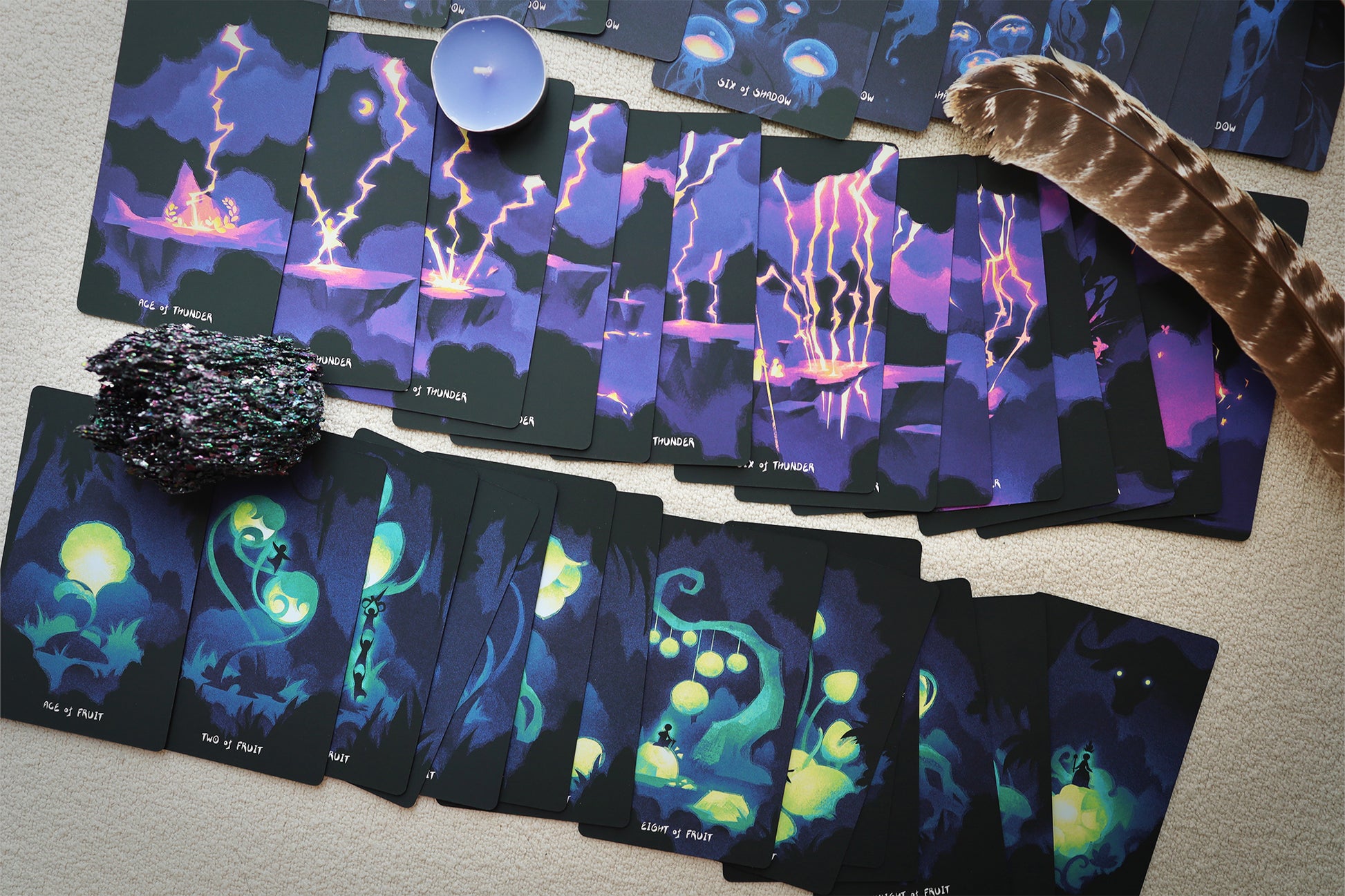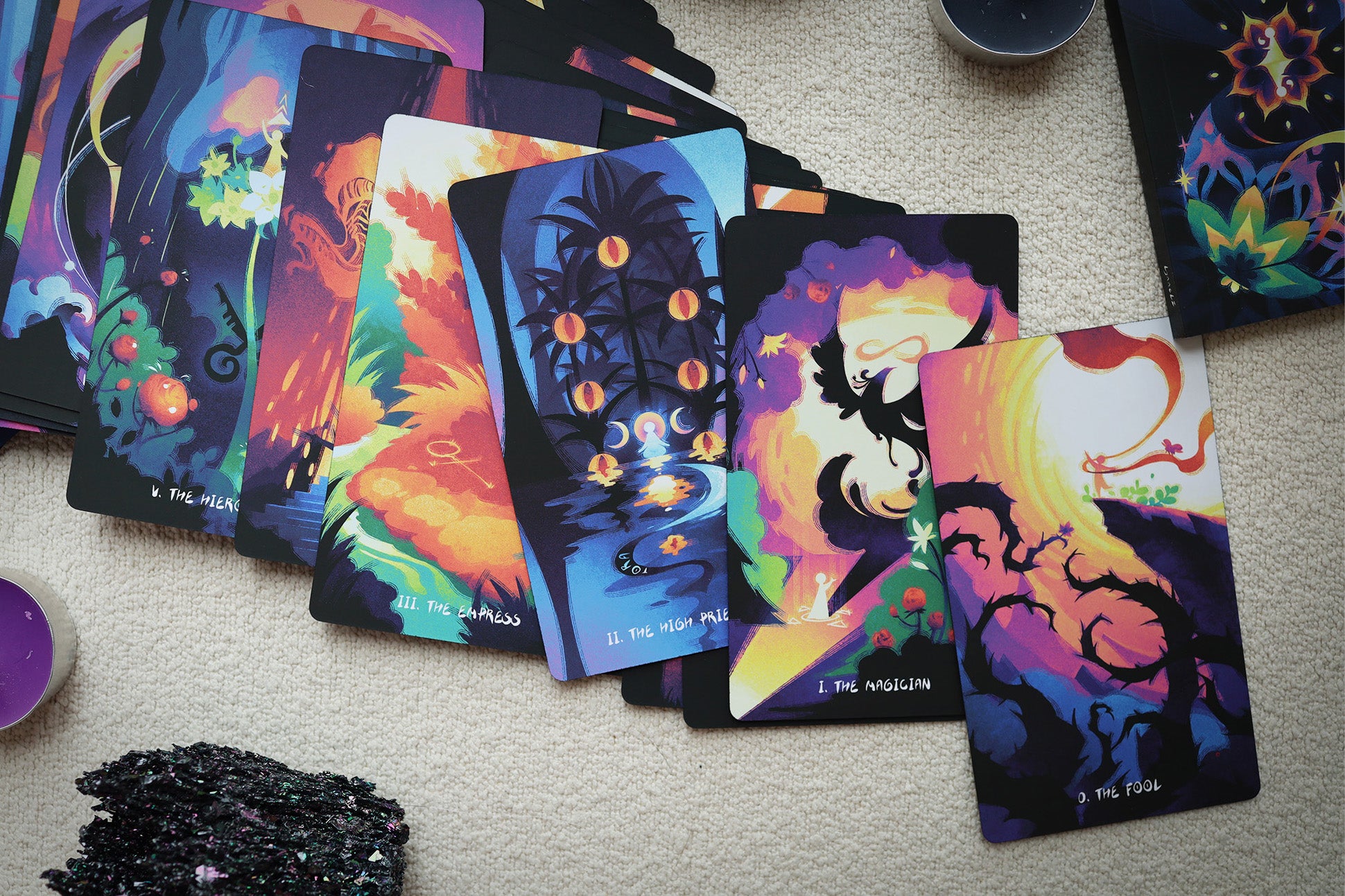 Under celestial guidance, embark on The Fool's journey towards enlightenment in this neon-drenched, surreal world. This immersive deck features abstract imagery themed around the interplay of light and shadow. Light, representing hope and initiative, empowers us to advance. Shadow, symbolizing conservation and stillness, urges us to recharge and introspect. By exploring both, users will find balance in their lives.