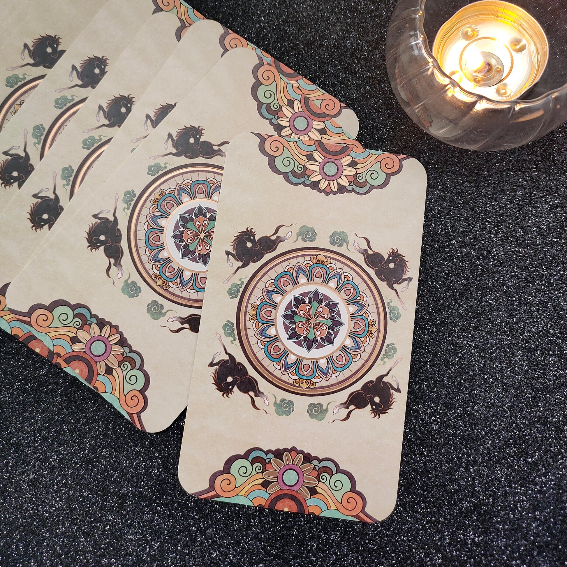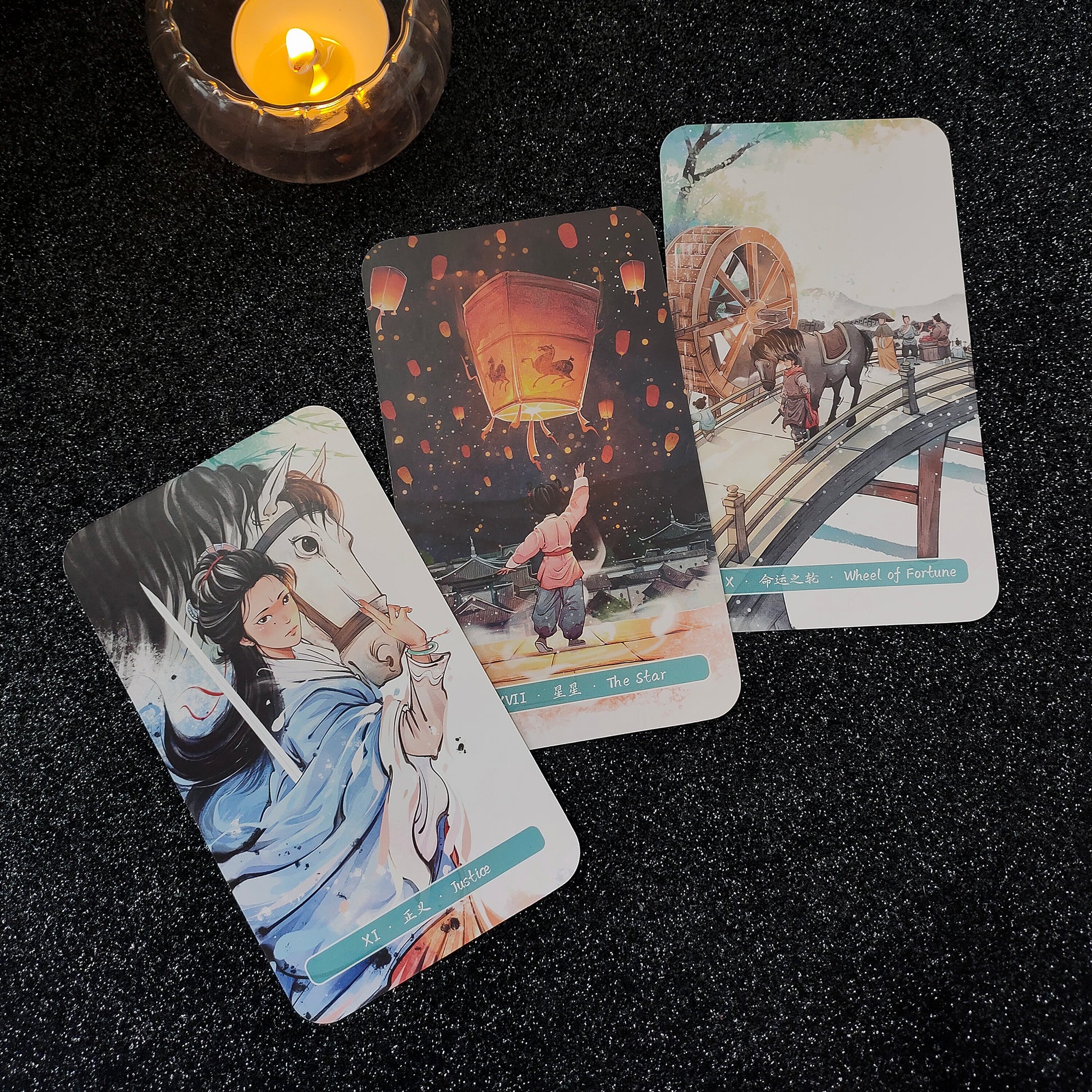 In the Year of the Horse, ride into a world where swords flash, bonds deepen, and destiny gallops beside a loyal steed. This 78-card deck reimagines the Rider-Waite Tarot through the lens of wuxia. Painted in sweeping ink-wash strokes, each arcana reveals a moment of tension or tenderness: a lone hero crossing rivers of fate, lovers on horseback, warriors charing through storm and flame. The Majors capture the charisma and conflicts of life in jianghu. The Minors evoke the chaos of battle, the ache of longing, the fire of revenge, and the warmth of everyday life. A collector's gem for 2026, and a tribute to the eternal dance between freedom and fate.