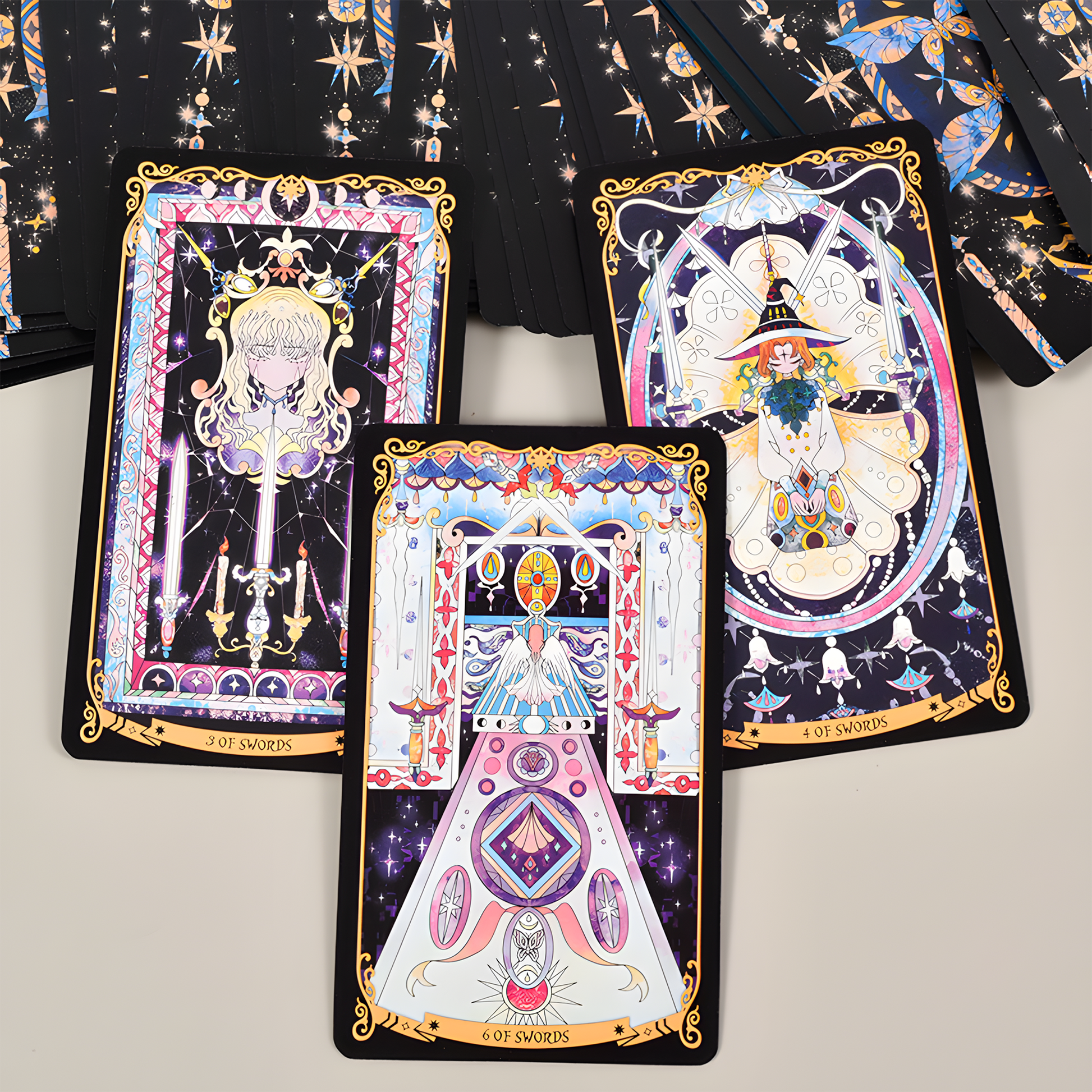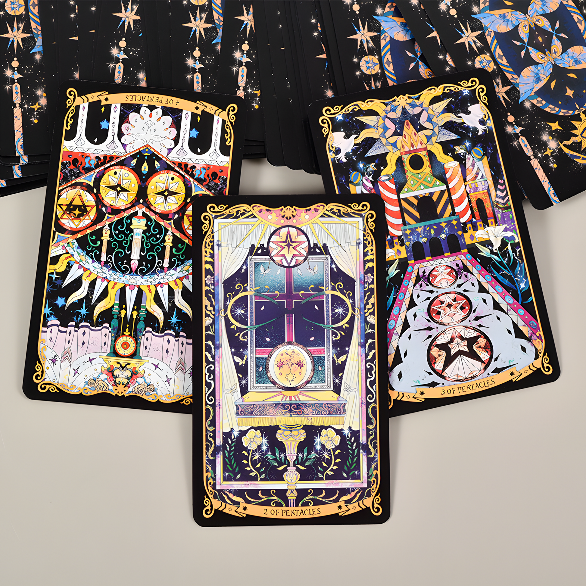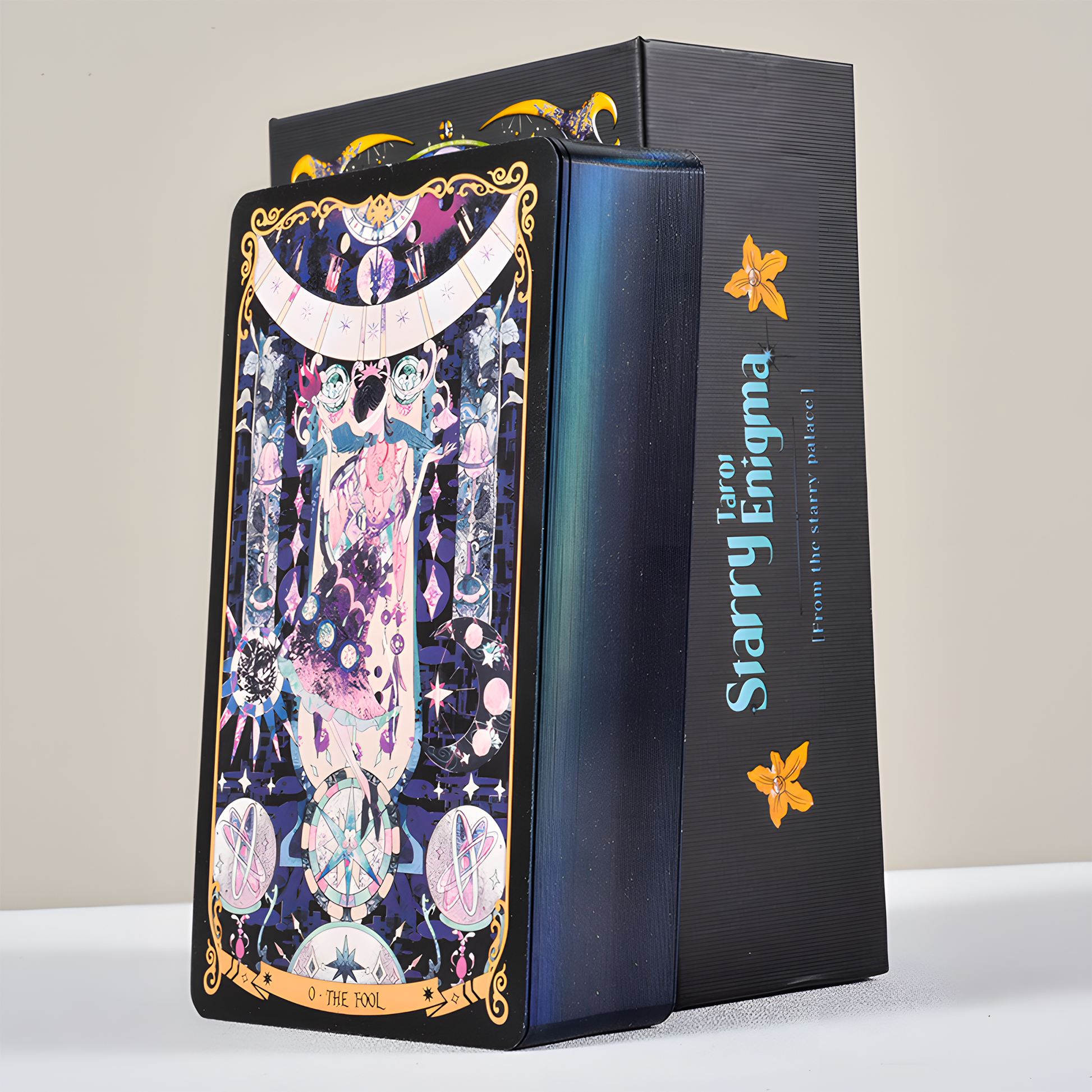Somewhere beyond time, an ancient kingdom floats in the vast starry cosmos, hidden within a crystal sphere. Explorers drawn to the same strange frequency find themselves guided by a palace of starlight – a place that records their journey in symbolic whispers. Starry Enigma Tarot is born from that dreamlike realm, each card a door, each symbol a riddle, shimmering with cosmic mystery and wonder.