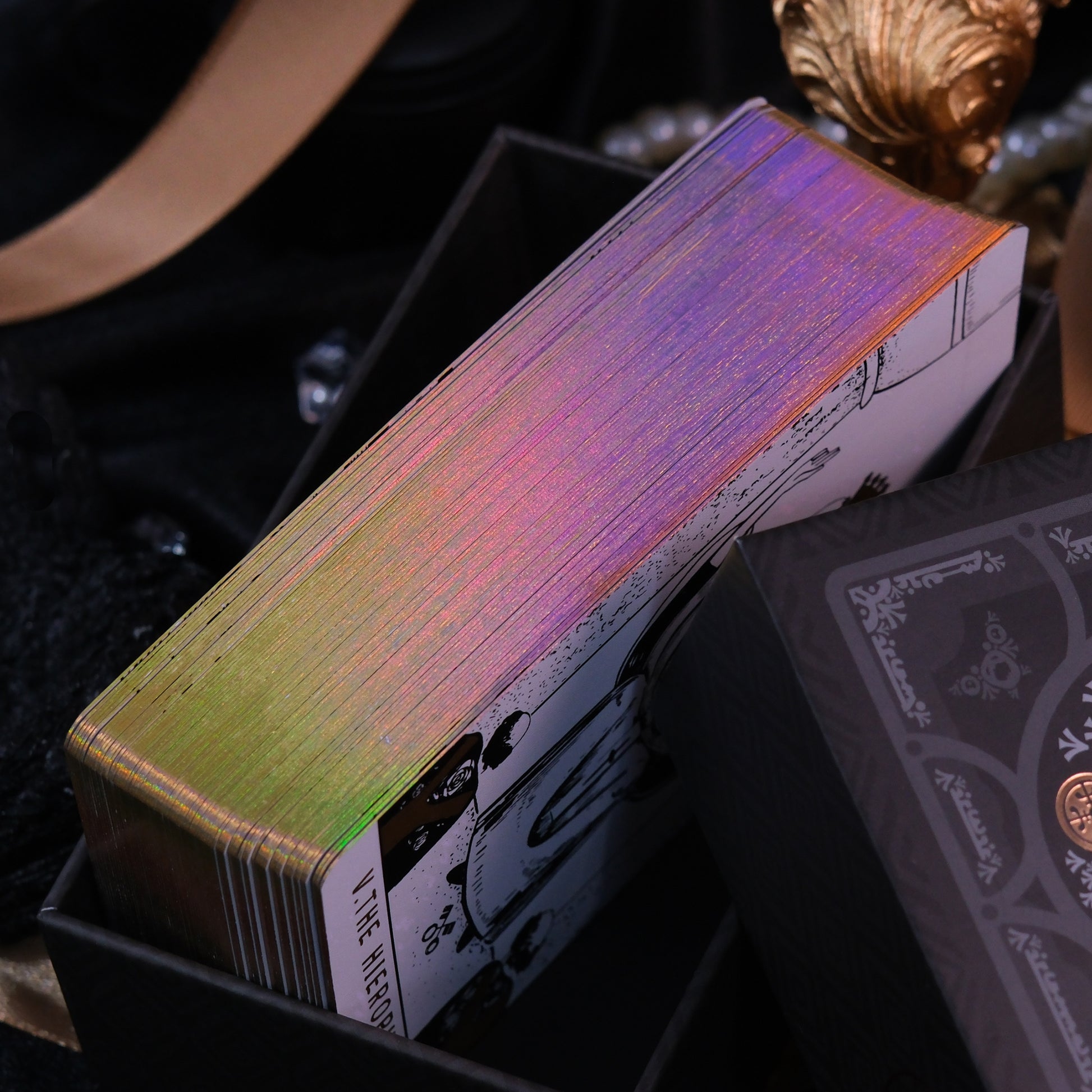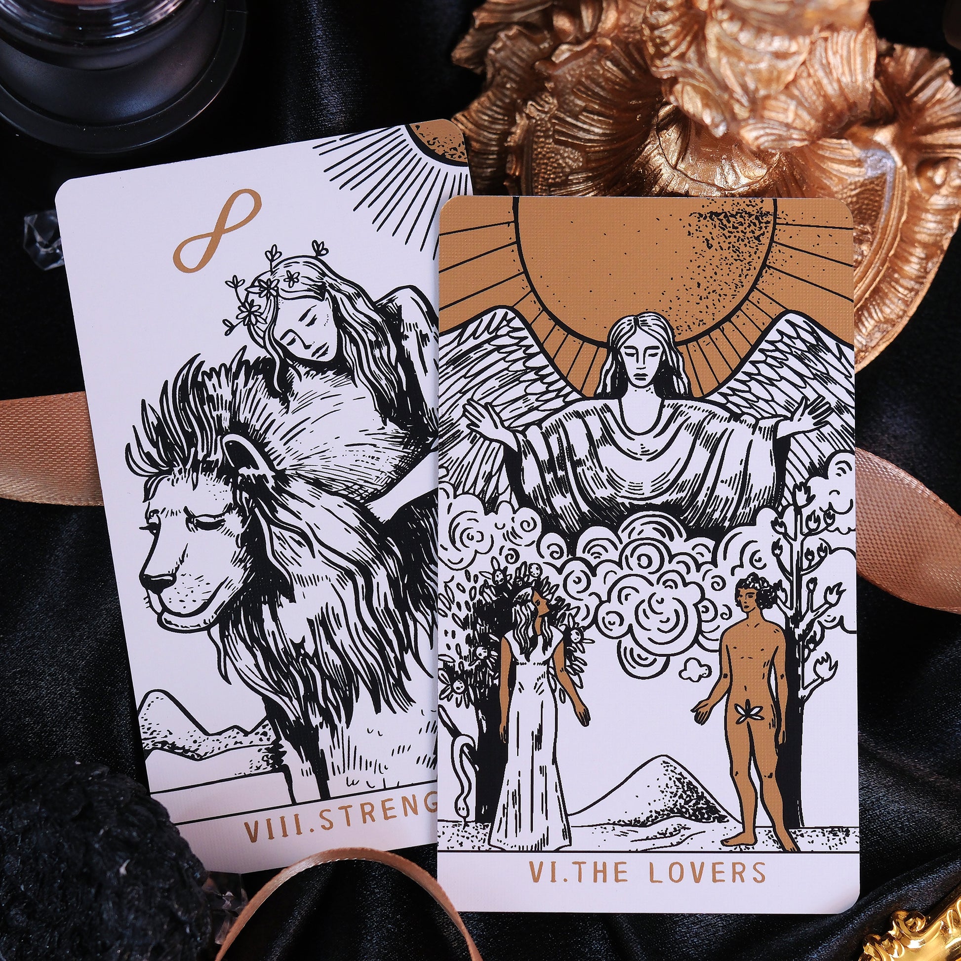 Imbued with a raw, animalistic energy, this deck is perfect for those drawn to nocturnal mysteries. The cards are illustrated in a style combining vintage comic aesthetics and precise line art to conjure visions both familiar and cryptic. Set against a pristine canvas, the classic combination of deep obsidian black and shimmering metallic gold brings to life secrets of ancient times while leaving behind more riddles to dance under the light.