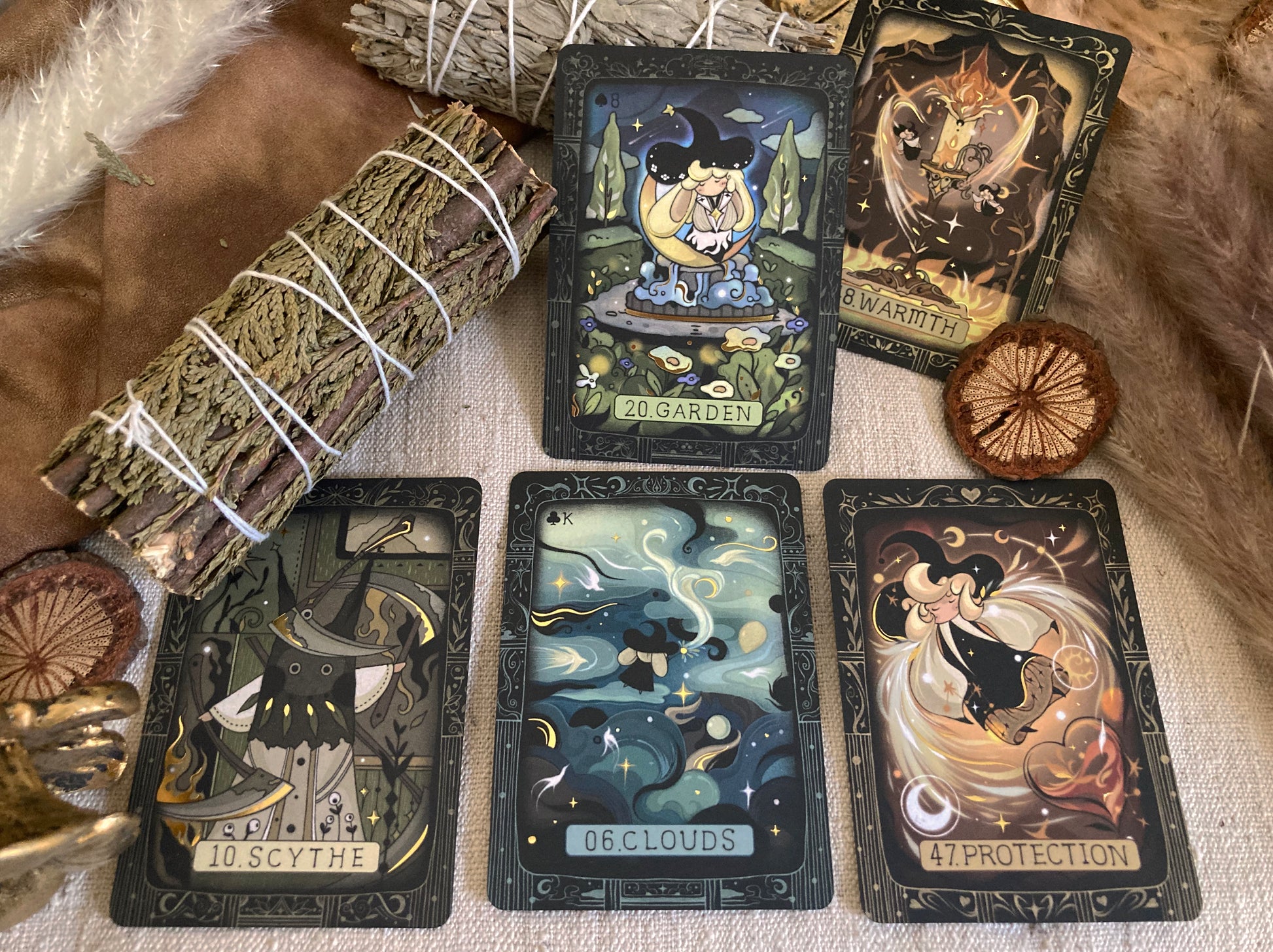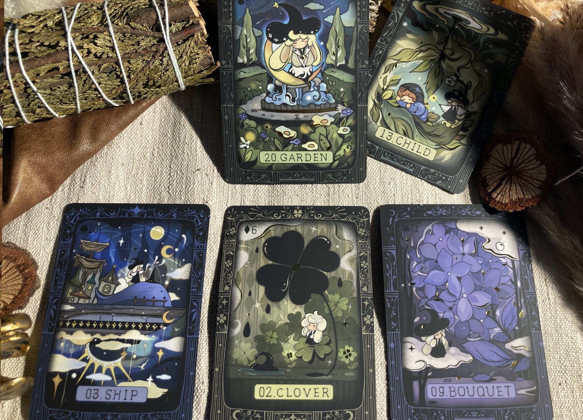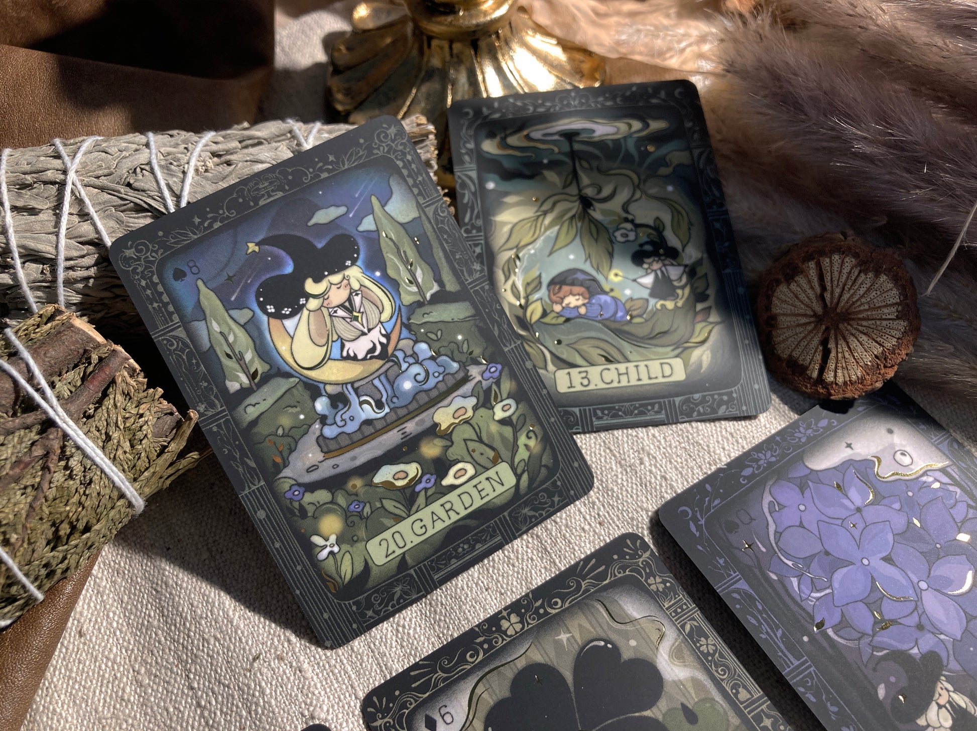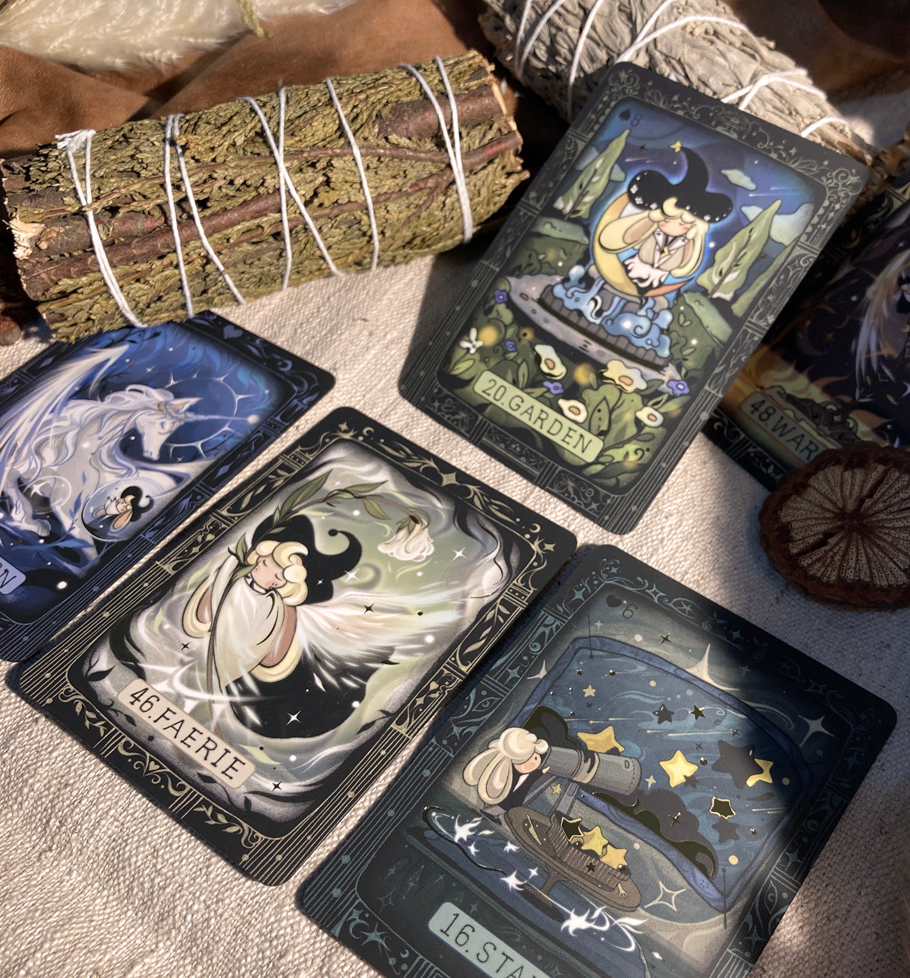 A hand-drawn diary of moods, a grimoire of the unsaid. This Lenormand deck is inspired by the small, unspoken emotions of student days. Notes scribbled in the margins. Secrets you bit your tongue to keep. Silly reasons to laugh or cry. At its heart lives a mage lamb, a stargazer from a faraway dreamscape, running through each card like a guardian of feelings. With vines as brushes and clouds as canvas, it paints the starlit fragments of life into tender, magical illustrations.